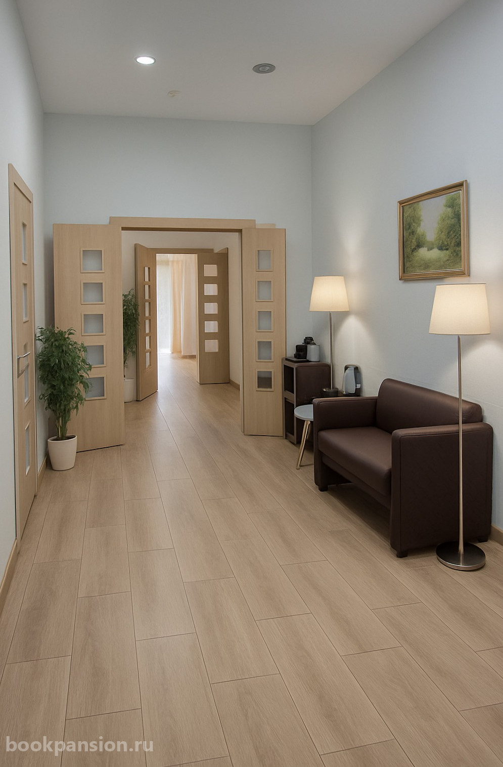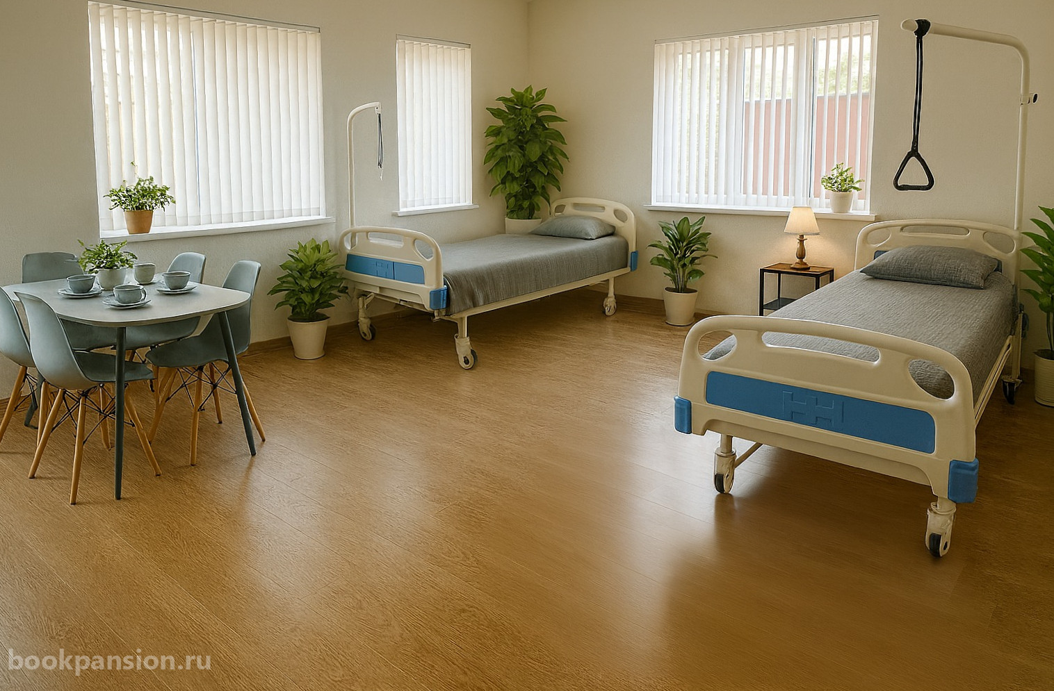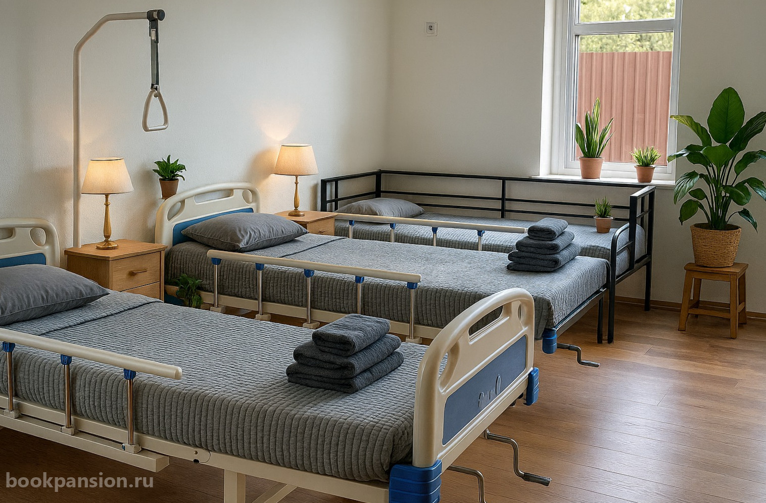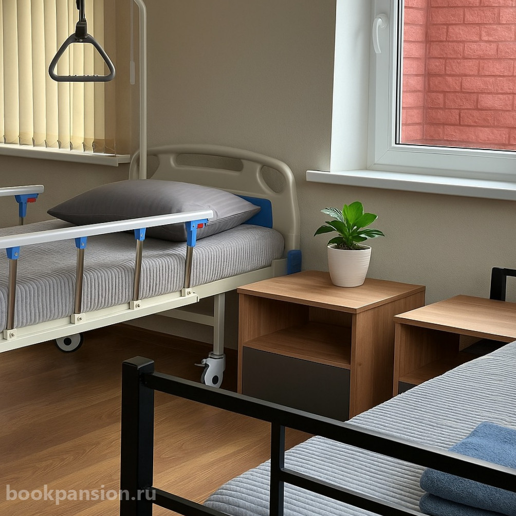 Пансионат предлагает различные варианты размещения – от уютных одноместных до комфортабельных пятиместных комнат. Каждое помещение оборудовано современными функциональными кроватями, телевизорами с голосовым управлением и специальными приспособлениями для маломобильных постояльцев. Санузлы оснащены надежными поручнями, обеспечивающими безопасность.